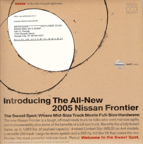☛Front of mailer with “Sweet Spot Calculator” showing through glassine window.
